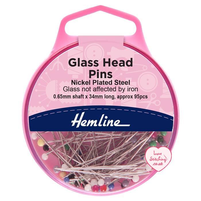 Hemline Glass head pins 95 pieces, Nickel plated steel with glass head. Heads not affected by a hot iron.