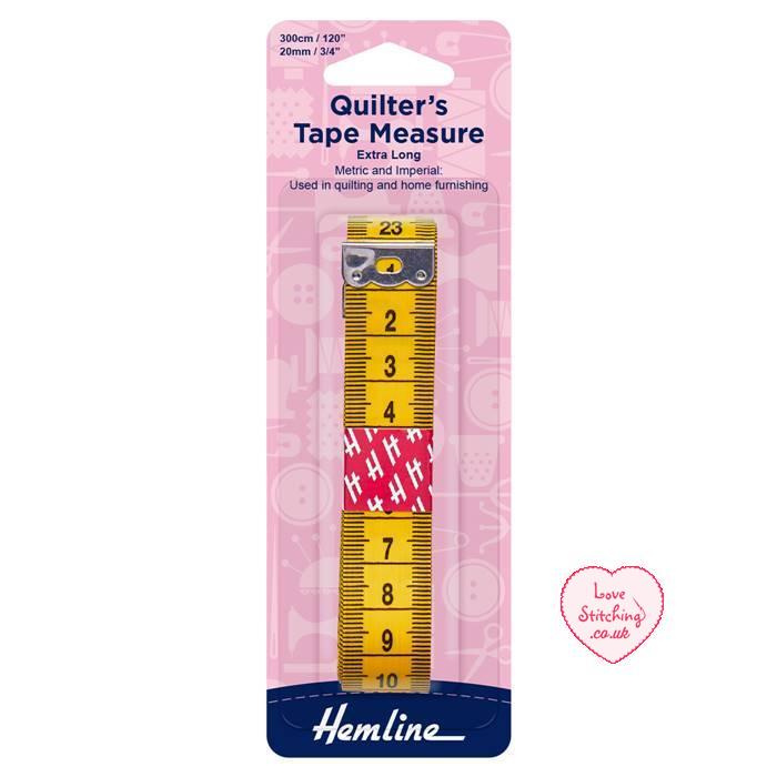 Extra long, double-sided, metric/imperial tape measure. Used for quilting, tailoring and home decorating. 5cm/2in steel end aids measurement of inside leg or arms lengths with greater accuracy. 20mm x 300cm, 3/4 x 120in.