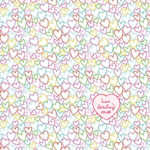 Bright multi colour hearts on a white background, a perfect little filler on any little girls quilt.