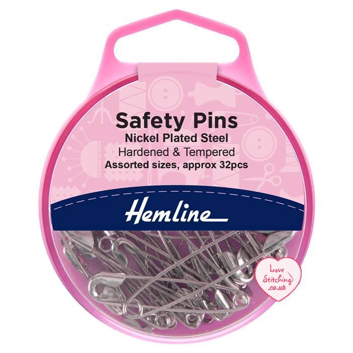 Hemline Safety Pins 32 assorted sized pieces per pack. Hardened and tempered Nickel. Useful reclosable storage box.