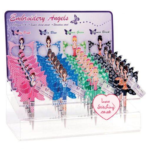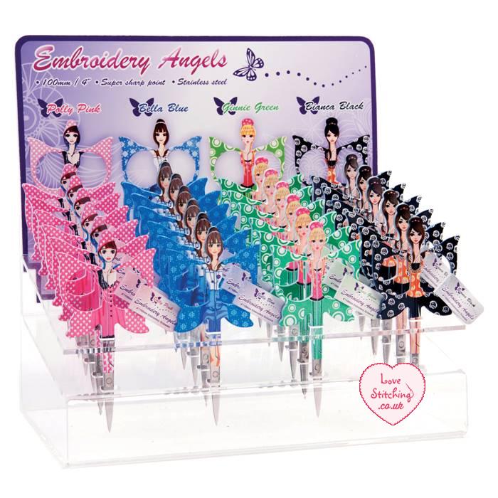 24 piece, super-sharp, 10cm/4in embroidery scissors with angel print grip. Great for teenagers and young crafters. Four angelic characters.